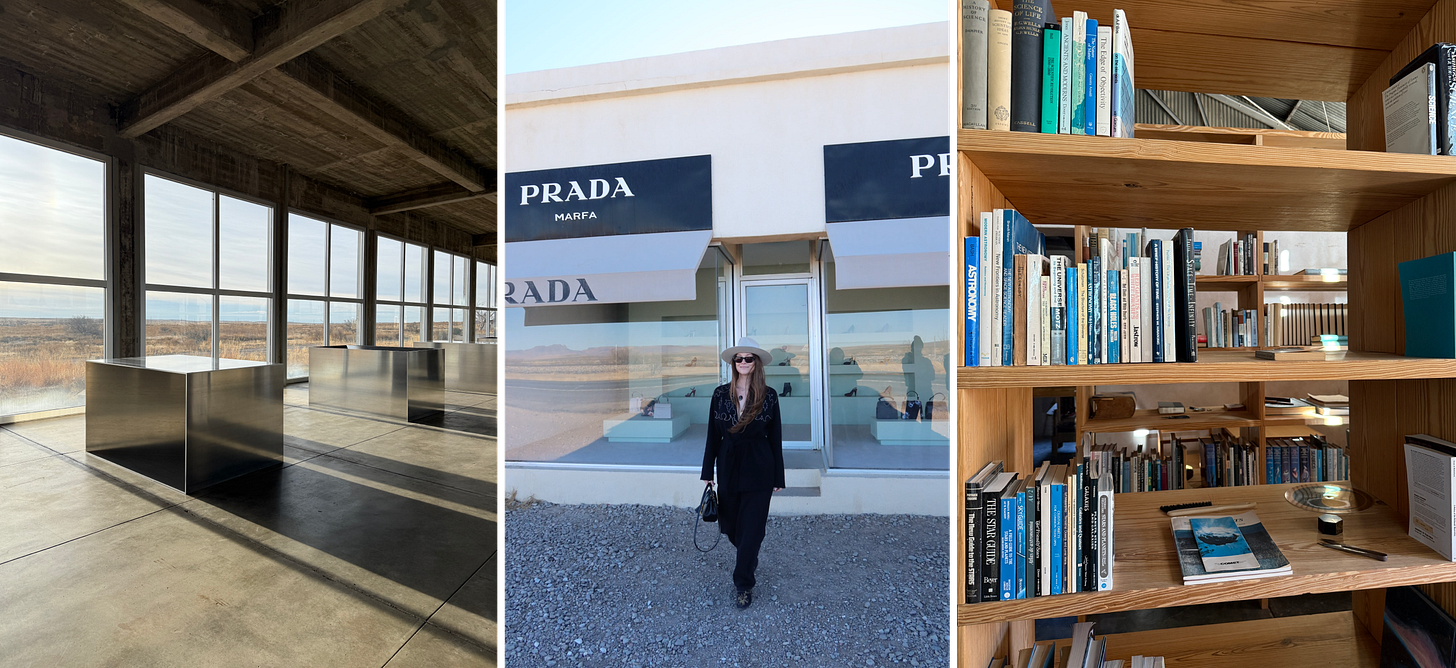 One of my favorite things to do is travel for art. If Marfa has been sitting on your list, consider this your sign. It’s perfect for a long weekend. Spending time in Donald Judd’s library alone was worth the trip — let alone the light, the space, and all the other quietly extraordinary corners of that tiny desert town. More to come in a ‘traveling for art’ Substack soon!